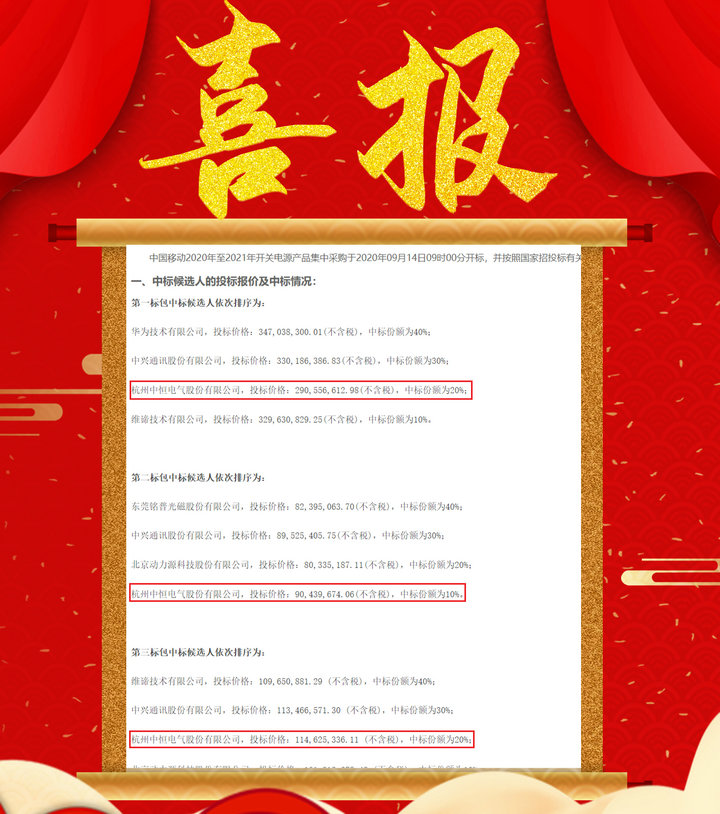 2020年9月15日,中恒電氣分立式開關電源、壁掛式開關電源、嵌入式開關電源均獲選中國移動2020年至2021年開關電源產品集中采購項目中標候選人,并取得較大份額。此次預中標,是繼5G-PAD電源、組合式開關電源、直流遠供電源大份額中標運營商集采項目后,其他系列網絡能源產品再次中標運營商集采項目,意味著中恒全系列通信電源產品及5G電源整體解決方案得到行業高度認可和信任,并將為5G網絡能源基礎設施建設奠定良好基礎,同時,更進一步加深了公司與運營商的合作!
